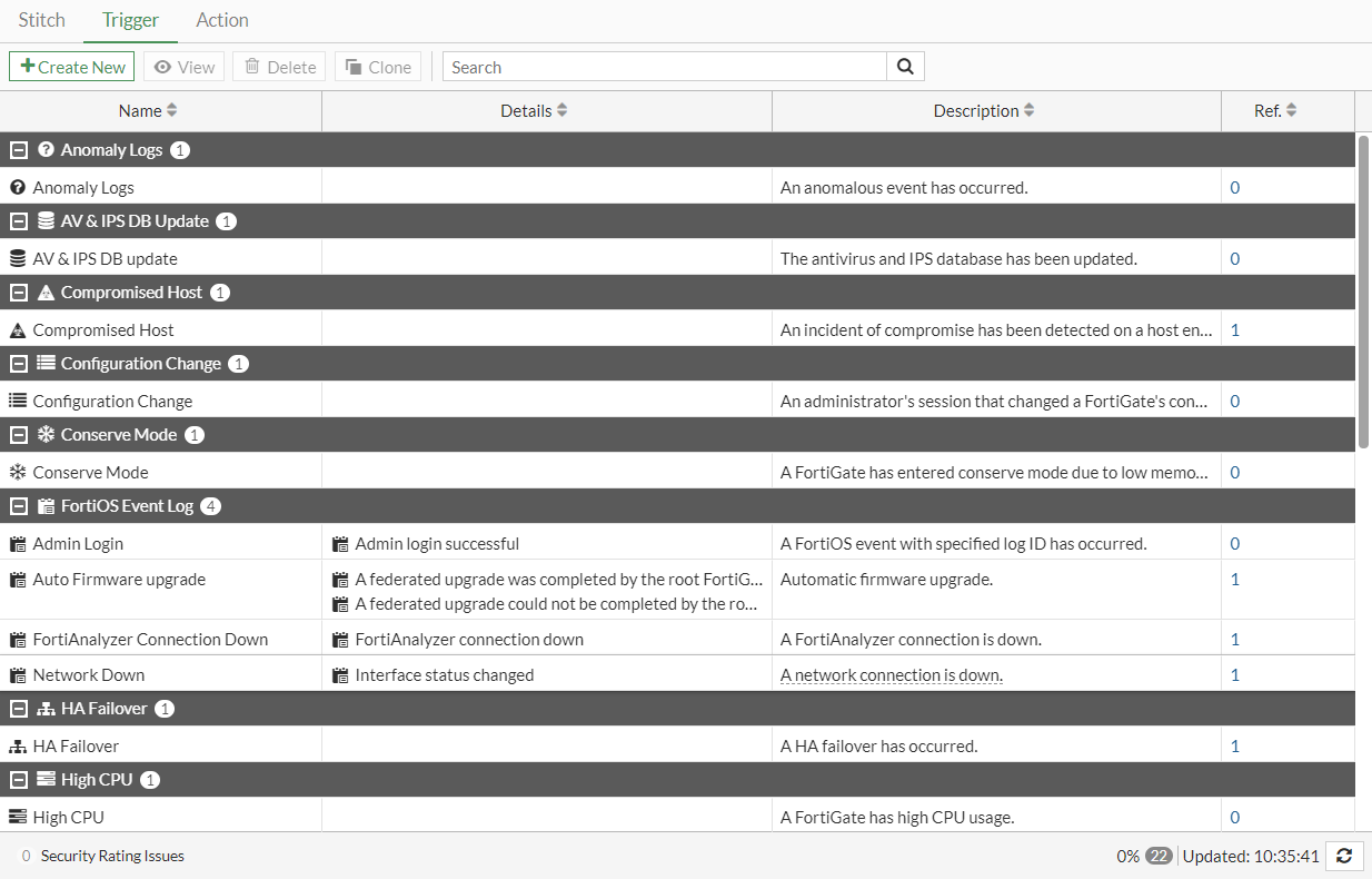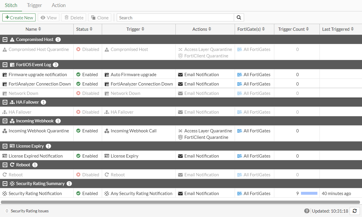 On the Security Fabric > Automation page, there are tabs for Stitch, Trigger, and Action. The Stitch tab is the default view that lists the trigger and actions used in each stitch. Individual triggers and actions can be created or edited in the corresponding tabs.