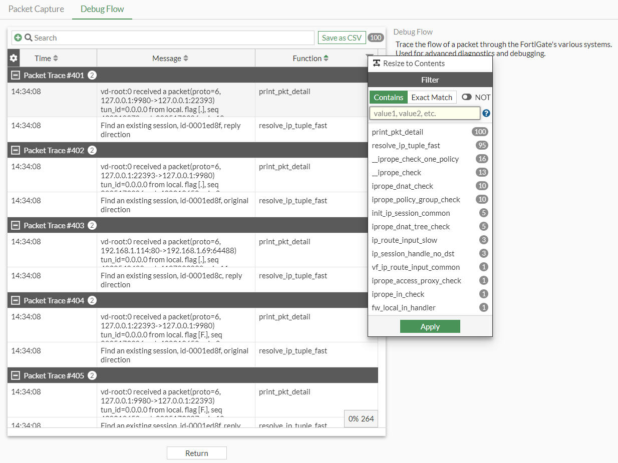 Go to Network > Diagnostics and select the Debug Flow tab.