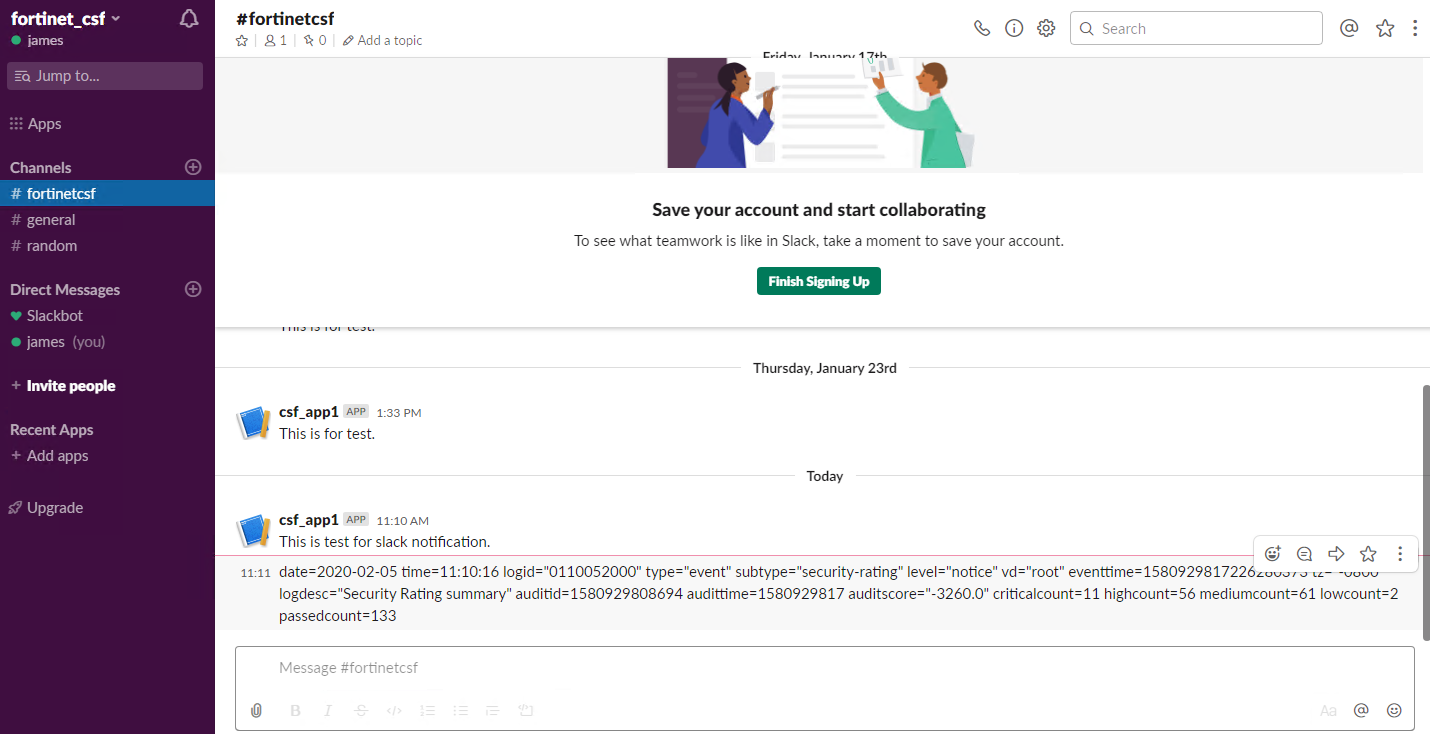 After the Security Rating report is finished, the automation is triggered and an event log is created by the FortiGate. The two notifications are sent to the Slack channel.