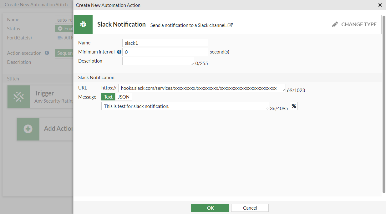 config system automation-action edit "slack1" set action-type slack-notification set message "This is test for slack notification." set uri "hooks.slack.com/services/xxxxxxxxx/xxxxxxxxx/xxxxxxxxxxxxxxxxxxxxxxxx" next edit "slack2" set action-type slack-notification set uri "hooks.slack.com/services/xxxxxxxxx/xxxxxxxxx/xxxxxxxxxxxxxxxxxxxxxxxx" next end -
