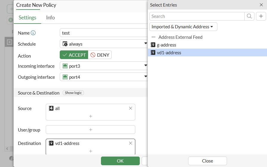 For Destination, select vd1-address. Since this policy is configured under vd1, g-address can also be set as the destination.