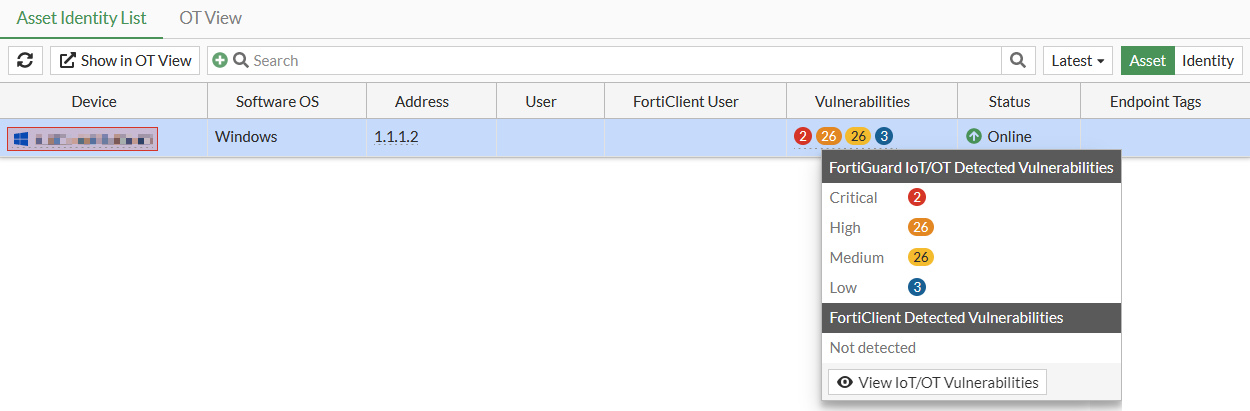 Hover over the Vulnerabilities count to view the tooltip and click View IoT/OT Vulnerabilities.