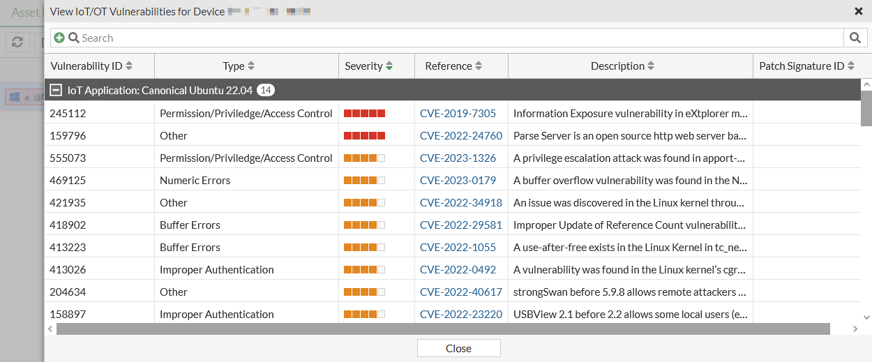 Hovering over the data in the Vulnerabilities column displays a list of FortiGuard IoT/OT Detected Vulnerabilities and FortiClient Detected Vulnerabilities. Clicking the View IoT/OT Vulnerabilities button in the tooltip opens the View IoT/OT Vulnerabilities table that includes the Vulnerability ID, Type, Severity, Reference, Description, and Patch Signature ID. Each entry in the Reference column includes the CVE number and a link to the CVE details.