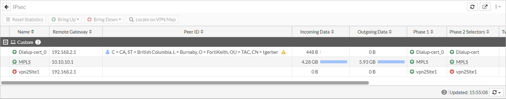# execute log filter category 1 # execute log filter field subtype vpn # execute log display 7: date=2021-08-23 time=15:53:08 eventtime=1629759188862005740 tz="-0700" logid="0101037138" type="event" subtype="vpn" level="notice" vd="root" logdesc="IPsec connection status changed" msg="IPsec connection status change" action="tunnel-up" remip=192.168.2.1 locip=192.168.2.5 remport=64916 locport=4500 outintf="port1" cookies="19f05ebc8c2f7a0d/7716190005538db5" user="C = CA, ST = British Columbia, L = Burnaby, O = FortiKeith, OU = TAC, CN = tgerber" group="pki-ldap" useralt="C = CA, ST = British Columbia, L = Burnaby, O = FortiKeith, OU = TAC, CN = tgerber" xauthuser="N/A" xauthgroup="N/A" assignip=172.18.200.10 vpntunnel="Dialup-cert_0" tunnelip=172.18.200.10 tunnelid=3418215253 tunneltype="ipsec" duration=0 sentbyte=0 rcvdbyte=0 nextstat=0