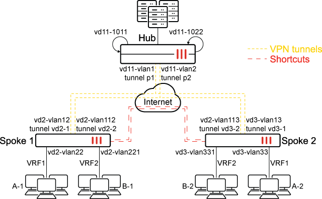 In this example, multiple companies (or departments of a company) share the same hub and spoke VPN infrastructure. Company A and company B each have two branches in two different locations. The goal is for company A’s branches (A-1 and A-2) to be able to communicate only with each other over VPN but not with company B’s branches. Likewise, company B’s branches (B-1 and B-2) can only communicate with each other over VPN but not with company A’s. This is accomplished by placing each branch VLAN into their respective VRFs (VRF1 and VRF2), and encapsulating the VRF information within the VPN tunnel. The hub forms BGP peering with its neighbors, spoke 1 and spoke 2, over each IPsec overlay. The hub’s BGP route reflector reflects the routes to the corresponding VRFs, allowing each spoke to form ADVPN shortcuts with the other spoke for each VRF.