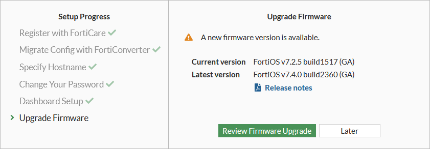Follow the steps in the Setup Progress, then click Review Firmware Upgrade.