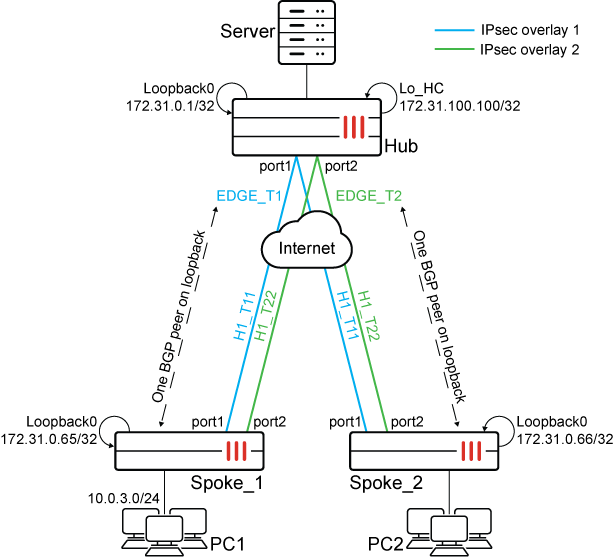 The SD-WAN topology with ADVPN and BGP neighbor on loopback is used for the following two examples: