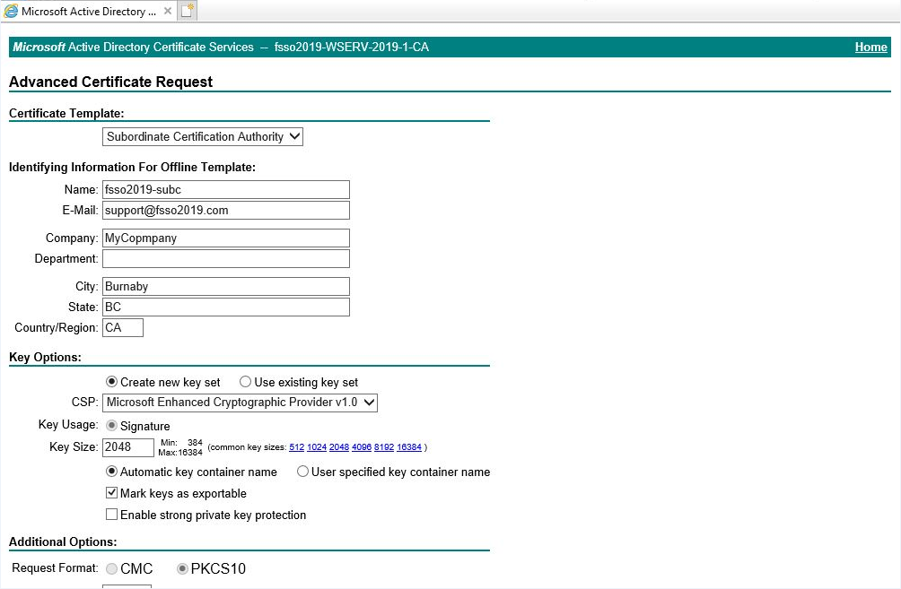- For the Certificate Template, select Subordinate Certification Authority.