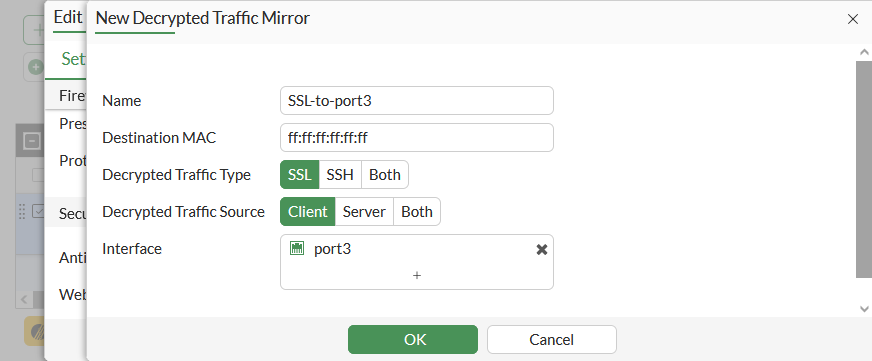 In this example, a new decrypted traffic mirror is created using the port3 interface.