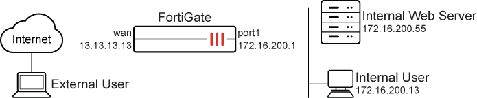 wan-lan) and SNAT (lan-wan):config firewall policy edit 2 set name "wan-lan" set srcintf "wan" set dstintf "port1" set action accept set srcaddr "all" set dstaddr "Internal_WebServer" set schedule "always" set service "ALL" set logtraffic all set nat enable next edit 3 set name "lan-wan" set srcintf "port1" set dstintf "wan" set action accept set srcaddr "all" set dstaddr "all" set schedule "always" set service "ALL" set logtraffic all set nat enable next end