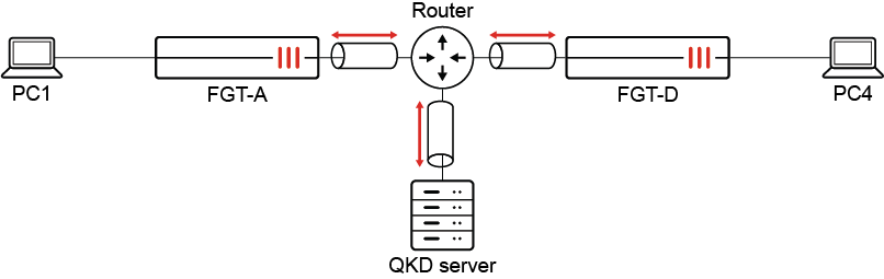In this example, a quantum key distribution (QKD) system is deployed to perform central IPsec key management. The FortiGates installed as security gateways will terminate large amount of IPsec tunnels.