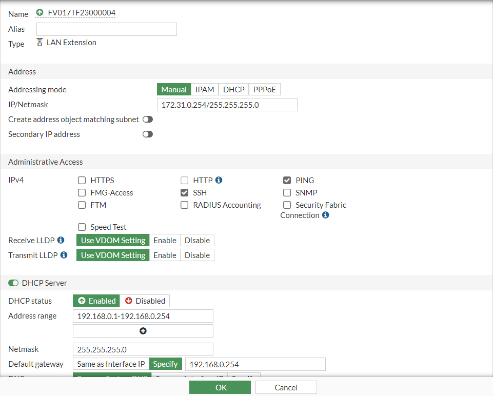 config system interface edit "FV017TF23000004" set vdom "root" set ip 172.31.0.254 255.255.255.0 set allowaccess ping ssh set type lan-extension set role lan set snmp-index 27 set ip-managed-by-fortiipam enable config ipv6 set ip6-send-adv enable set ip6-other-flag enable end set interface "fext-ipsec-wiUx" next end -