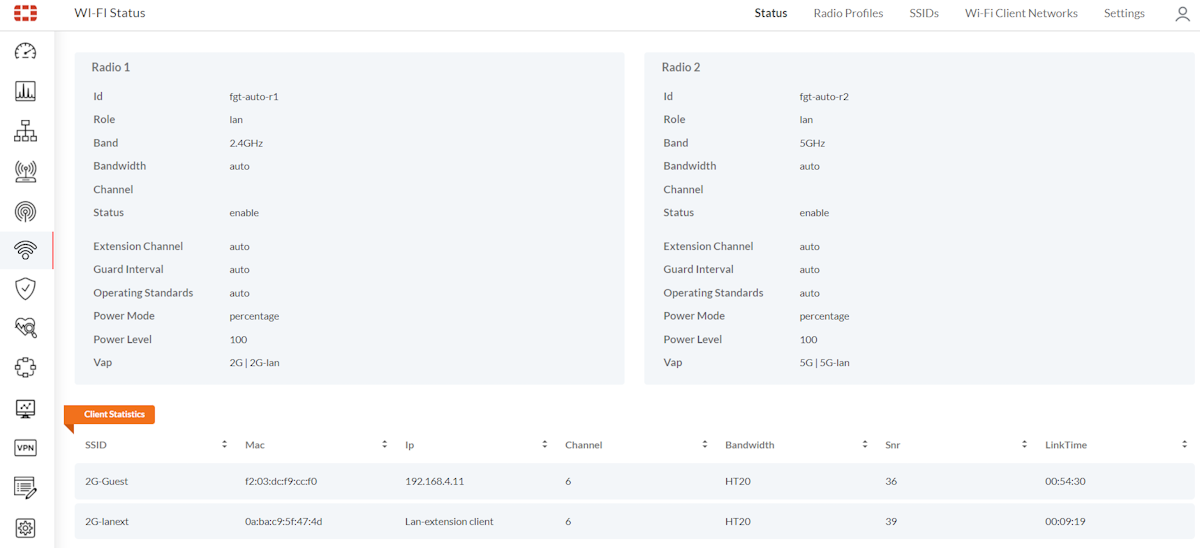 Go to Wi-Fi Status, and verify that the WiFi client is connected to the LAN extension SSID. In this example, the client is connected to 2G-lanext.