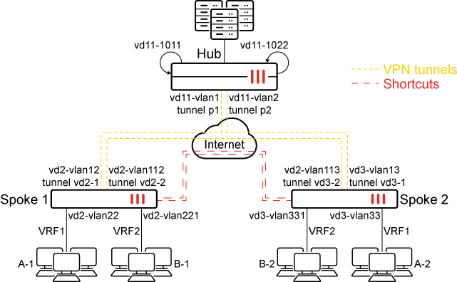 In example 1, multiple companies (or departments of a company) share the ADVPN. Company A and company B each have two branches in two different locations. Company A's branches (A-1 and A-2) can talk to each other using the VPN shortcut, but not to company B's branches (B-1 and B-2). Likewise, company B's branches can talk to each other using the VPN shortcut, but not to company A's branches. Traffic can share the tunnels and shortcuts, but cannot be mixed up.