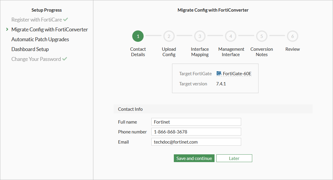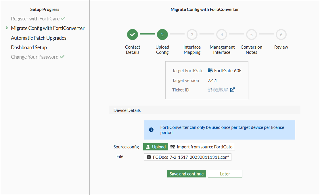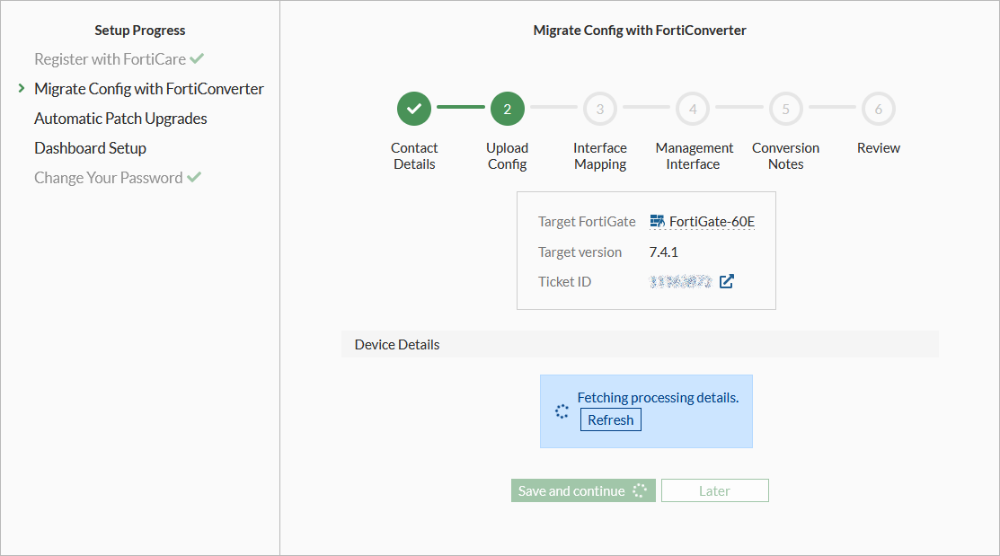 Click Save and continue, then wait for the FGTB configuration file to be uploaded to FortiConverter and processed. After the configuration is uploaded, the Allow FortiConverter to obtain config file once is automatically disabled on FGTB.