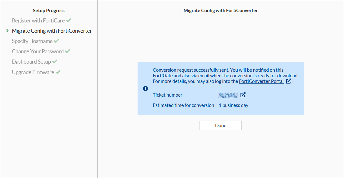 The conversion request is sent, an email is sent to confirm that the conversion process has started in FortiConverter, and the ticket status is shown. The estimated conversion time is one business day.