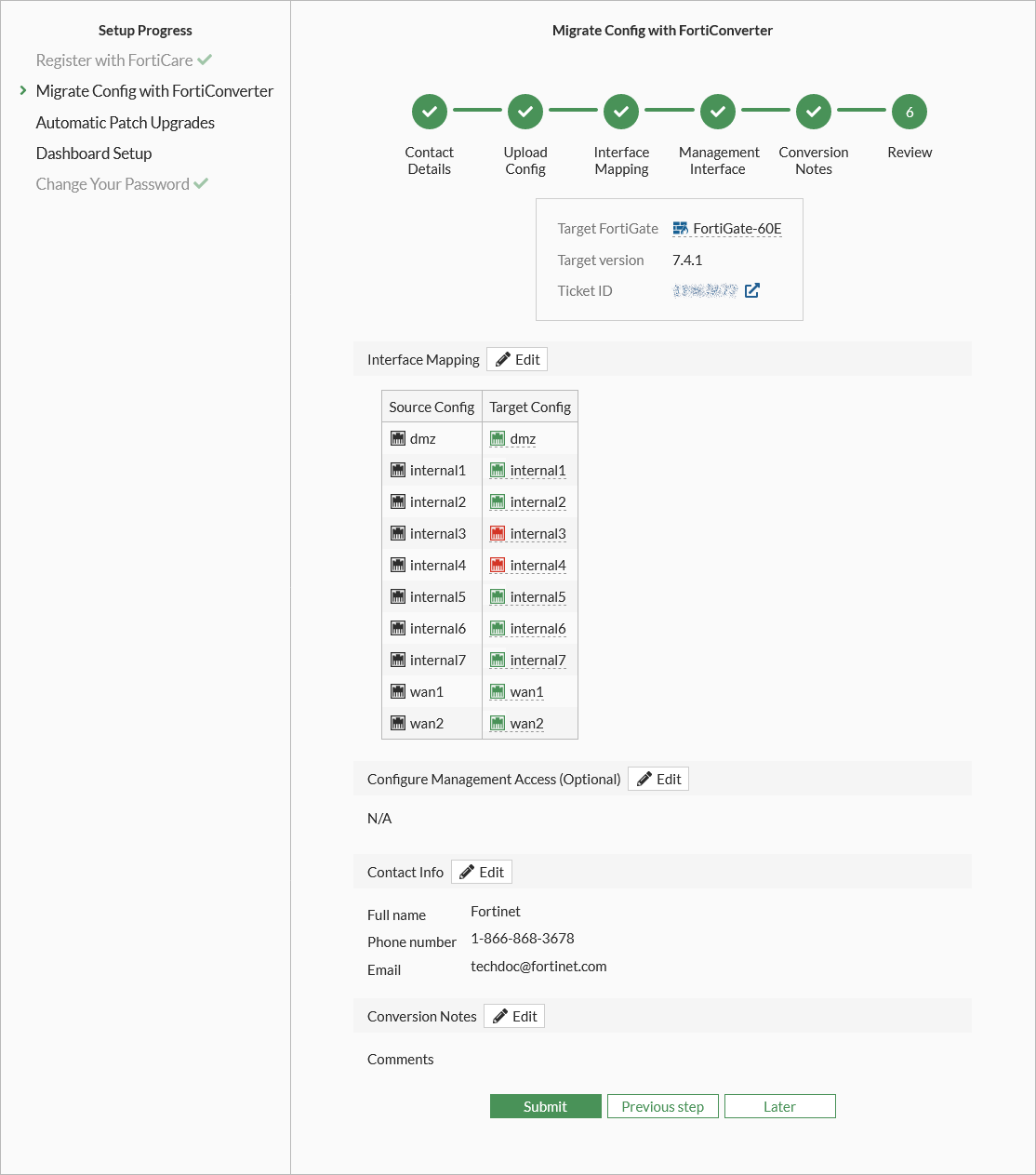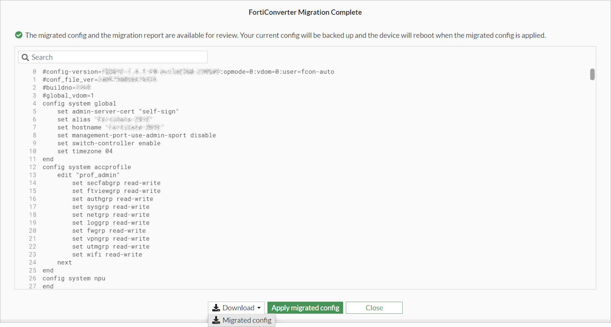 Click Apply migrated config to apply the converted configuration to the FortiGate. This will cause the FortiGate to reboot. The existing configuration will be backed up before the converted configuration is applied.