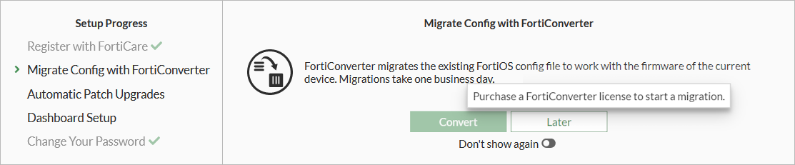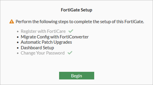 Log in to FGTA and on the GUI startup menu click Begin to start Migrate Config with FortiConverter.