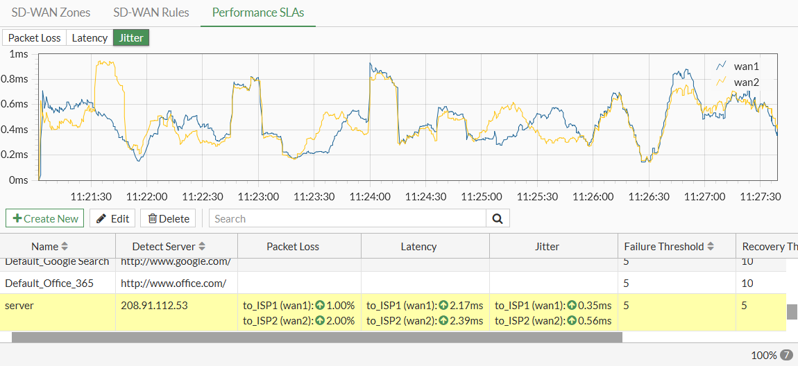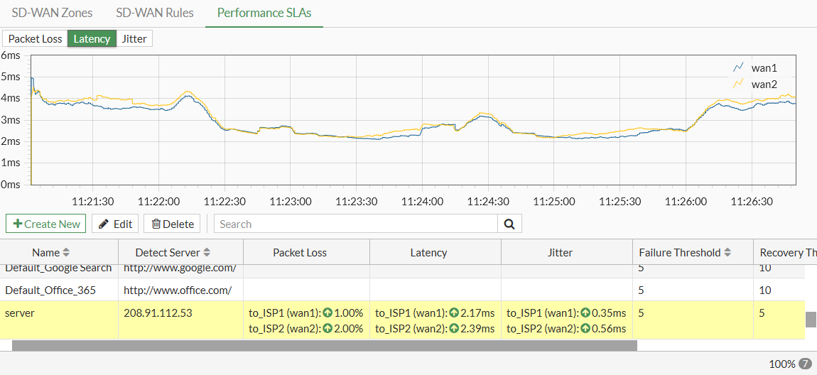 Go to Network > SD-WAN, select the Performance SLAs tab, and select the SLA from the table (server in this example) to view the packet loss, latency, and jitter on each SD-WAN member in the health check server.
