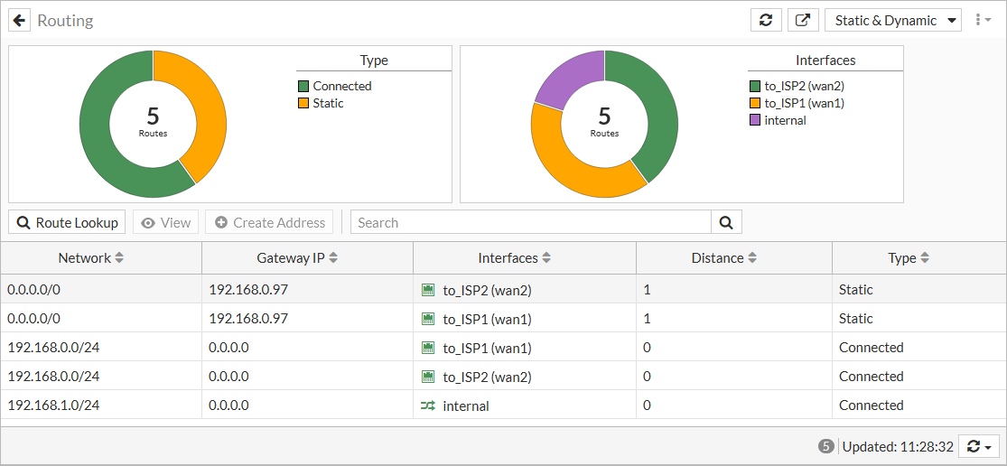 Go to Dashboard > Network and expand the Static & Dynamic widget to review all static and dynamic routes. For more information about the widget, see Static & Dynamic Routing monitor.