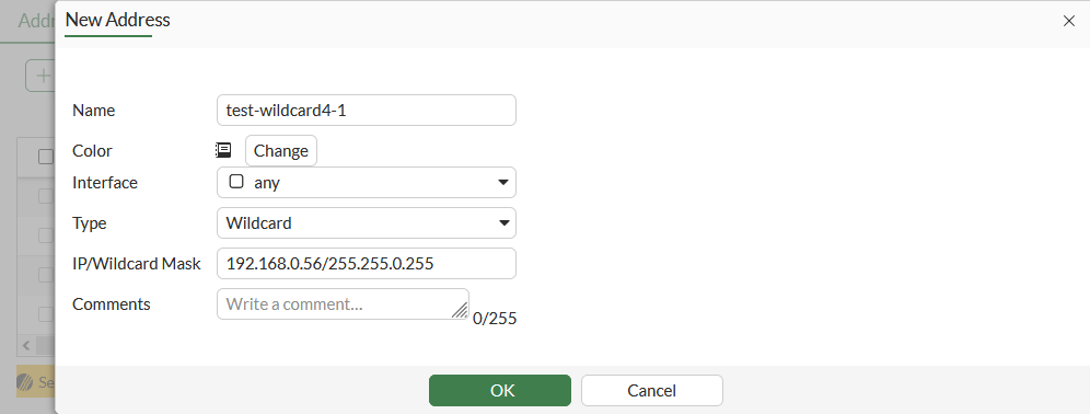 In a wildcard netmask, zero denotes ignoring the value of the octet in the IP address. This means that the wildcard firewall address matches any number in this address octet. This also means that the number included in this octet of IP address is ignored and can be any number. Usually, if the octet in the wildcard netmask is zero, the corresponding octet in the IP address is also zero.