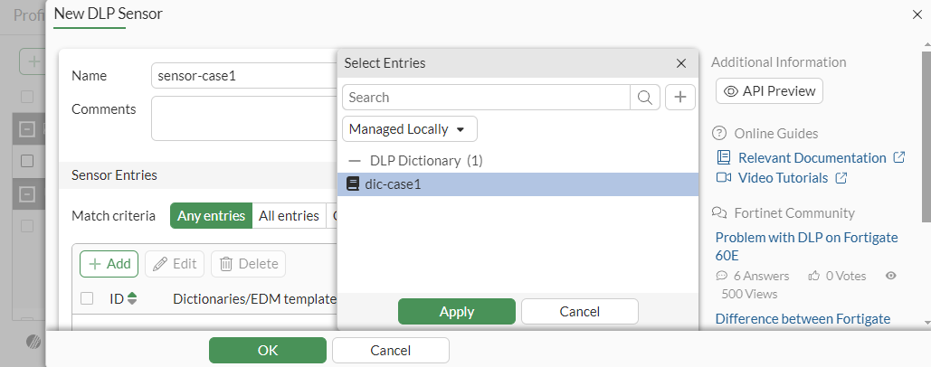 config dlp sensor edit "sensor-case1" config entries edit 1 set dictionary "dic-case1" next end next end -