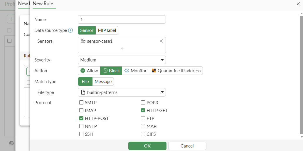 config dlp profile edit "profile-case1" set feature-set proxy config rule edit 1 set name "1" set proto http-get http-post set filter-by sensor set file-type 1 set sensor "sensor-case1" set action block next end next end -