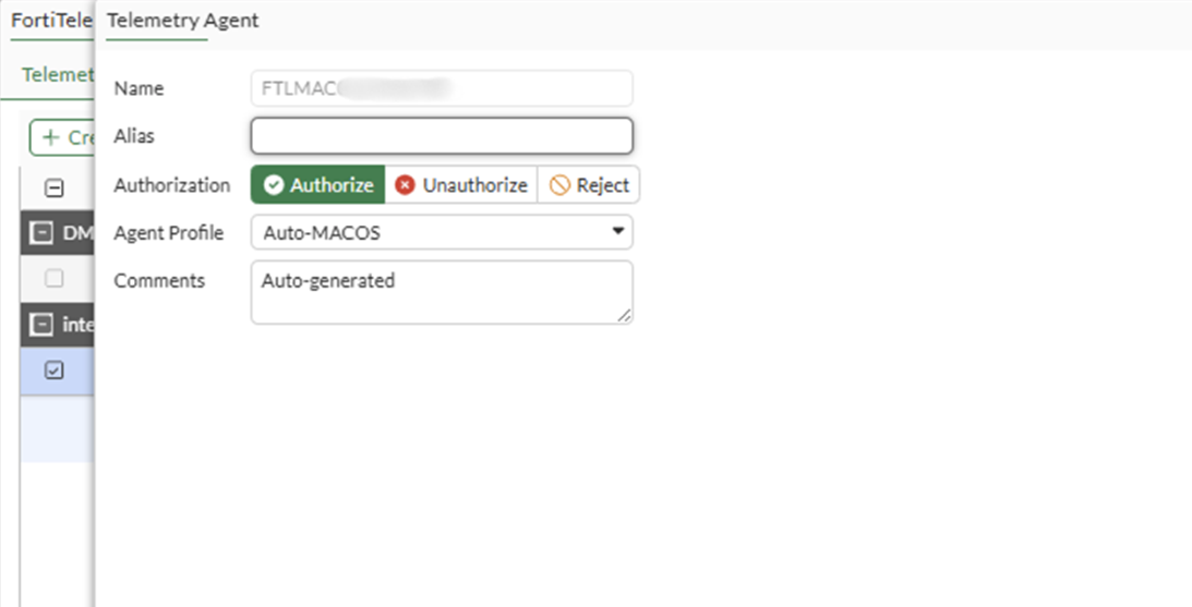 (Optional) Enter an alias for the FortiTelemetry agent.