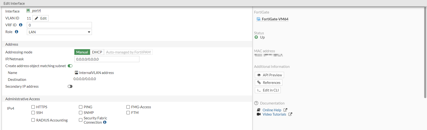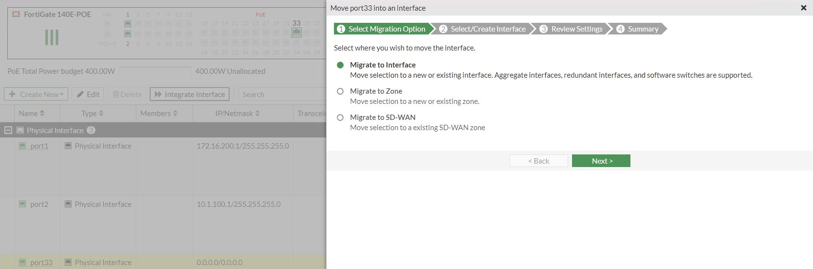 The Integrate Interface option on the Network > Interfaces page helps migrate a physical port into another interface or interface type such as aggregate, software switch, redundant, zone, or SD-WAN zone. The FortiGate will migrate object references either by replacing the existing instance with the new interface, or deleting the existing instance based on the user's choice. Users can also change the VLAN ID of existing VLAN sub-interface or FortiSwitch VLANs.