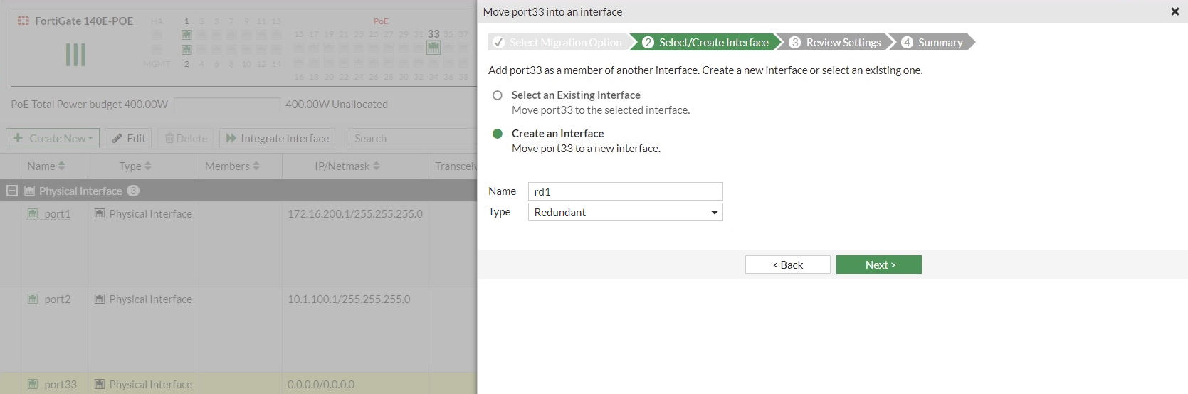 Select Create an Interface. Enter a name (rd1) and set the Type to Redundant.