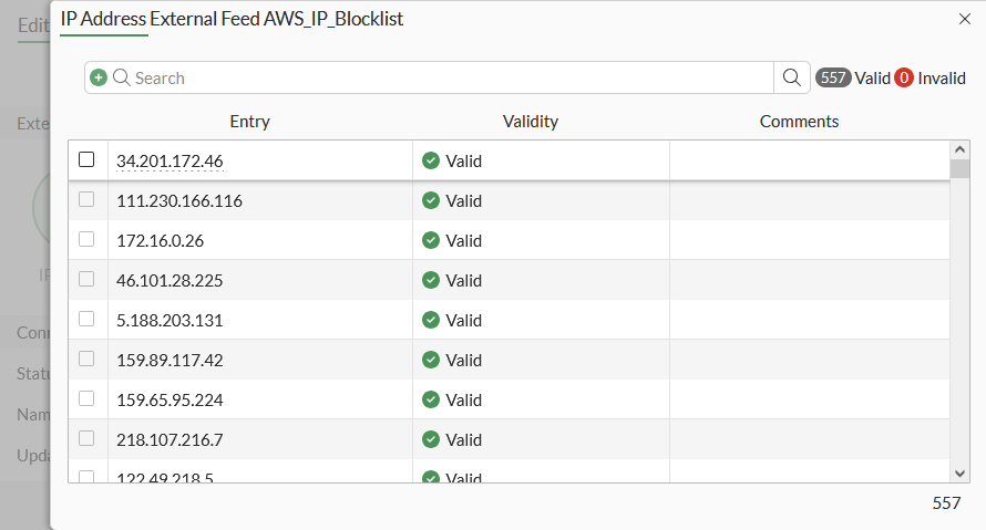 In this example, a previously created IP address external feed named AWS_IP_Blocklist is used as a source address in a local-in-policy. Any traffic originating from any of the IP addresses in the external feed list and destined for the FortiGate will be dropped.
