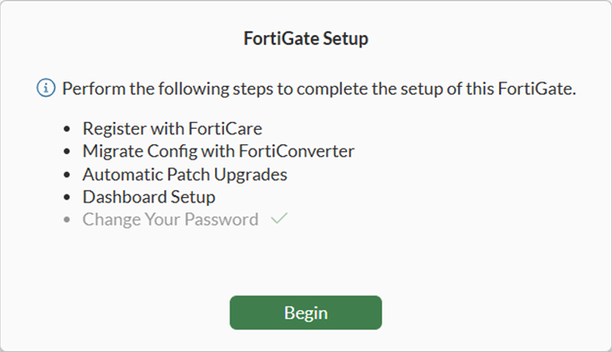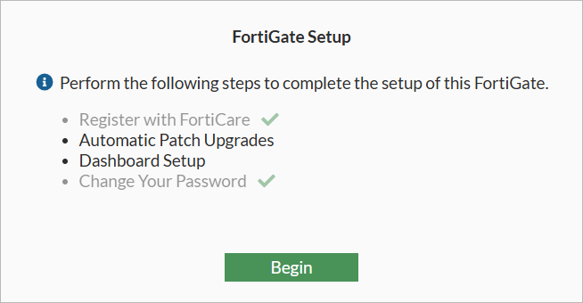 Click Begin to continue. See also Completing the FortiGate Setup wizard.