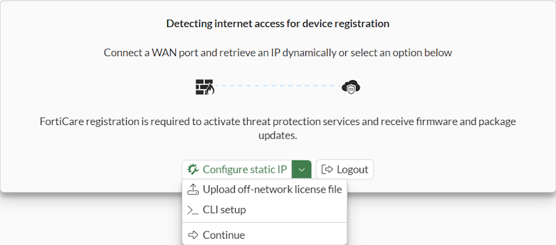 The FortiGate setup wizard can be used to manually upload a previously downloaded license file, allowing successful registration even when the device is unable to reach FortiCare. On FortiCare, register the FortiGate, download the license file, and use the wizard to upload the offline license file to the off-network FortiGate. As long as the FortiGate serial number in the license file matches the serial number of the off-network FortiGate, the device is considered registered. This is particularly useful for air-gapped environments where the lack of internet connectivity is by design.