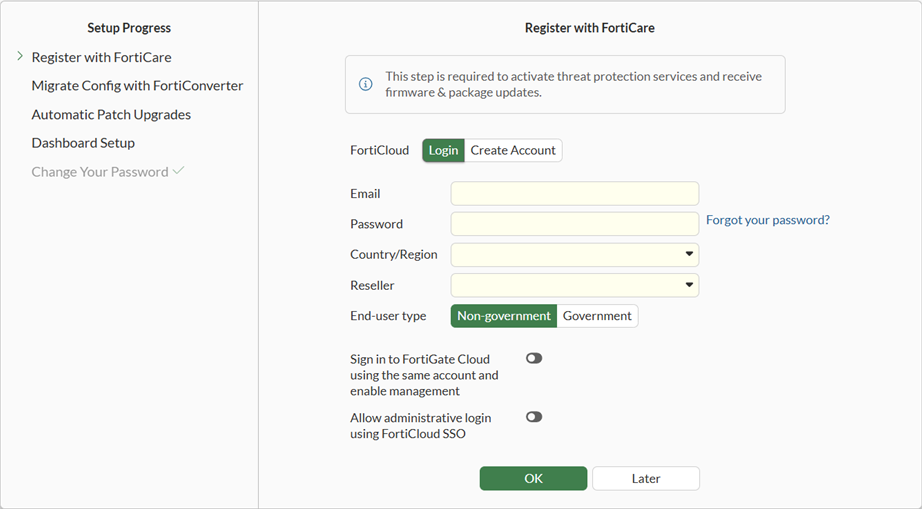 Click Later to proceed without registering the FortiGate to FortiCare.