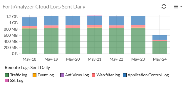 The Logs Sent widget displays a chart for a select remote logging source (FortiAnalyzer, FortiGate Cloud, and FortiAnalyzer Cloud). Once configured, the same data is available on the FortiAnalyzer and Cloud Logging tabs of the Logging & Analytics card.
