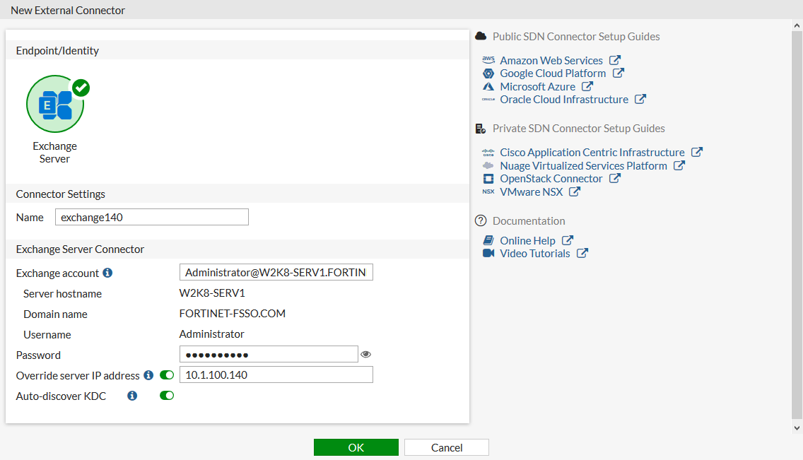 Set Exchange account to Administrator@W2K8-SERV1.FORTINET-FSSO.COM.