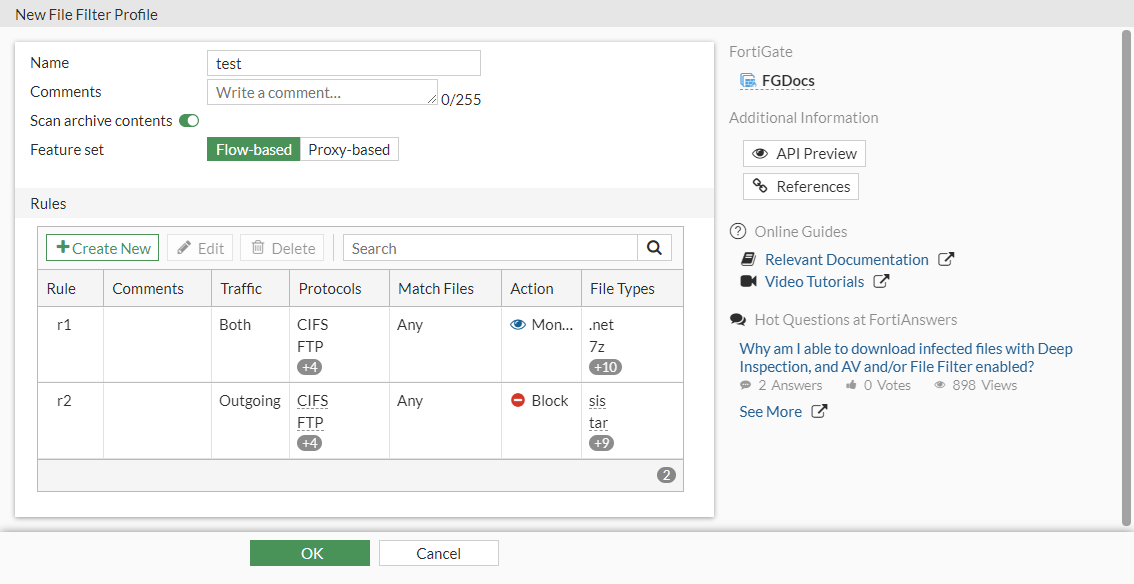 config file-filter profile edit "test" set comment '' set feature-set flow set replacemsg-group '' set log enable set scan-archive-contents enable config rules edit "r1" set comment '' set protocol http ftp smtp imap pop3 cifs set action log-only set direction any set password-protected any set file-type ".net" "7z" "activemime" "arj" "aspack" "avi" "base64" "bat" "binhex" "bmp" "bzip" "bzip2" next edit "r2" set comment '' set protocol http ftp smtp imap pop3 cifs set action block set direction outgoing set password-protected any set file-type "sis" "tar" "tiff" "torrent" "upx" "uue" "wav" "wma" "xar" "xz" "zip" next end next end - Apply the filter to a policy: