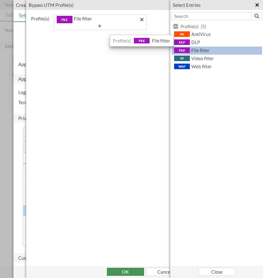 In this example, UTM bypass is configured for Dropbox file downloading in the inline CASB profile.