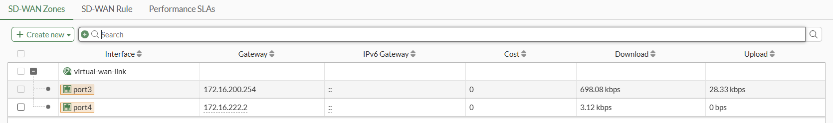 config system sdwan set status enable config zone edit "virtual-wan-link" next end config members edit 1 set interface "port3" set gateway 172.16.200.254 next edit 2 set interface "port4" set gateway 172.16.222.2 next end end -