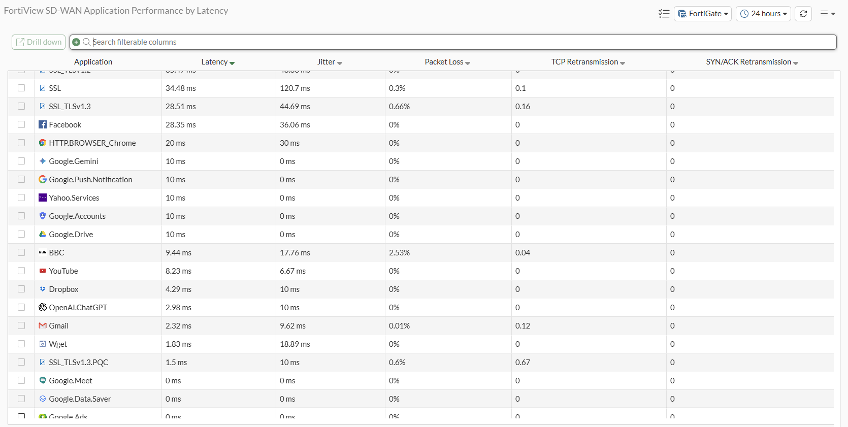 The FortiView SD-WAN Application Performance widget leverages the passive WAN application performance monitoring of SD-WAN to log and monitor application performance metrics. See also Application performance monitoring . These metrics are aggregated into the following FortiView report types: