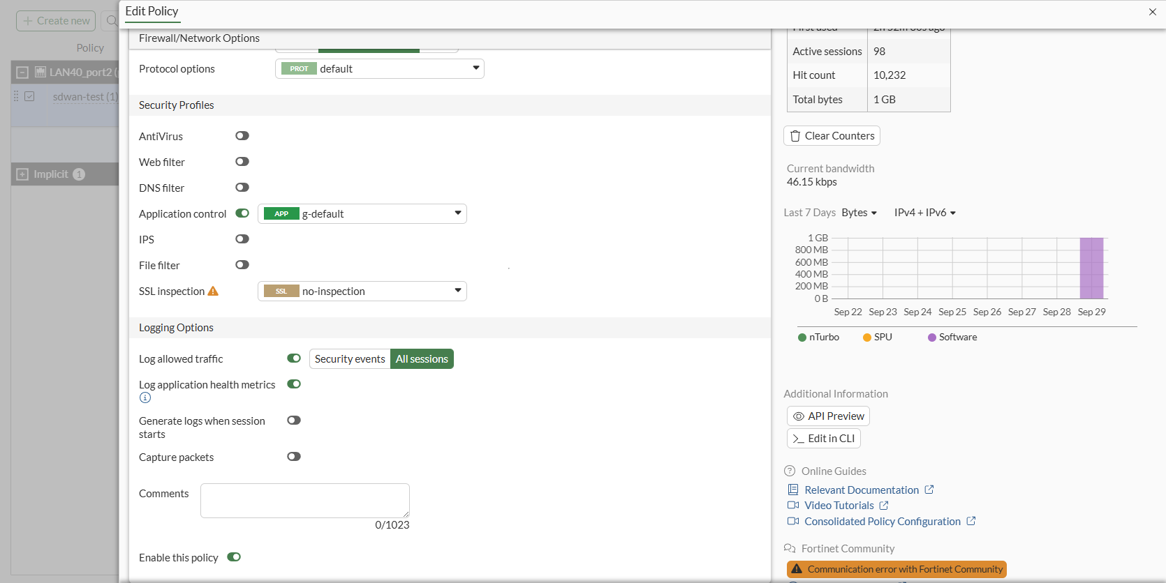 A new GUI option, Log application health metrics, is added to the firewall policy logging options section to enable the required logging for this widget.