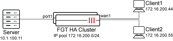 In the example, the server connects to Client2 and this opens up full cone NAT ports on the FortiGate cluster wan1 interface that allow CLient1 and Client2 to connect through the FortiGate to the server.