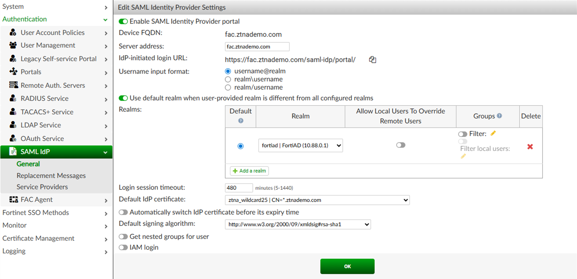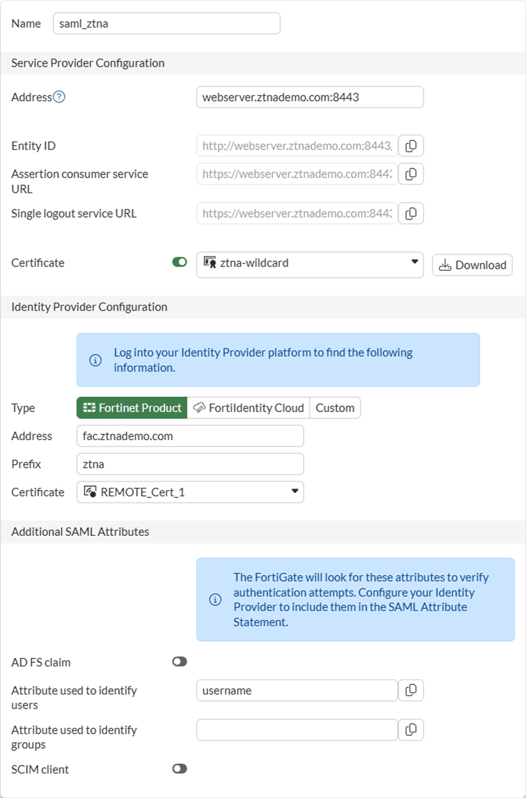 In this example, the ztna-wildcard certificate is a local certificate that is used to sign SAML messages that are exchanged between the client and the FortiGate SP.