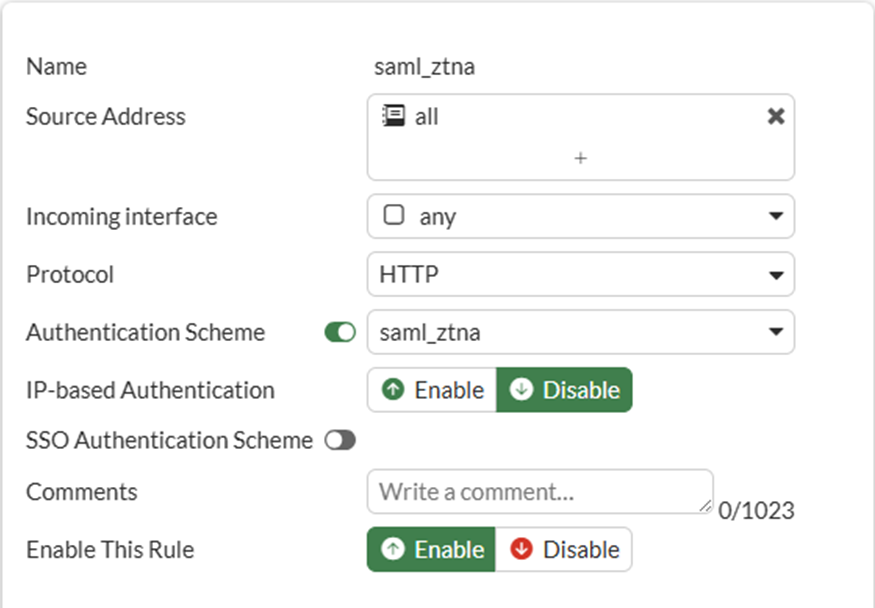 A simple ZTNA policy is created to apply the SAML authentication.