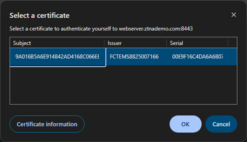 Select a certificate. Clients will be presented with this certificate when they connect to the ZTNA port.