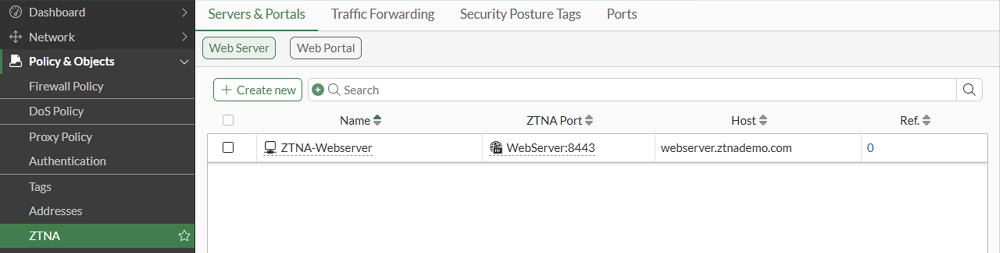 Go to Policy & Objects > ZTNA and select the Servers and Portals tab. Web Server is selected by default.