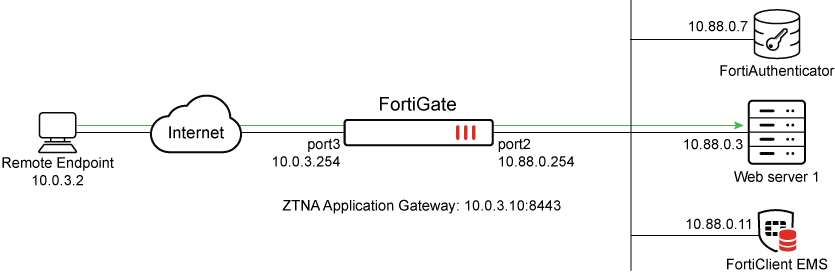 These steps will create a ZTNA application gateway of 10.0.3.10:8443 to proxy connections to 10.88.0.3:9043.