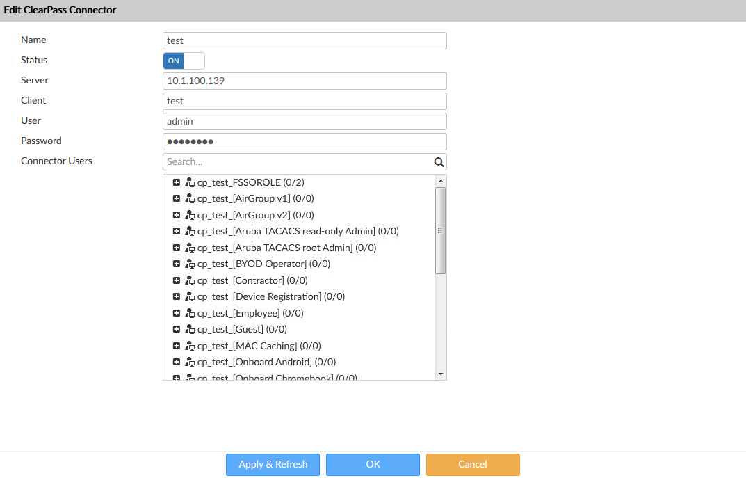 Establish communications between FortiManager and CPPM so that FortiManager can synchronize CPPM user groups. See Creating a ClearPass connector in the FortiManager Administration Guide.