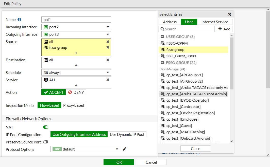 FSSO groups can come from multiple sources; CPPM FSSO groups are prefixed with cp_ and are listed under the FortiManager heading.