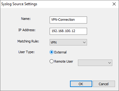Remote User: Users are defined on a remote LDAP server and user groups are retrieved from the specified LDAP server. Any group from the syslog messages are ignored. See Connect to a remote LDAP server .